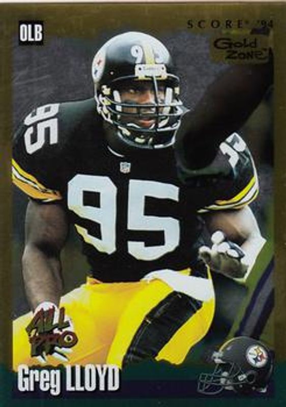 The Greg Lloyd 1994 Score #250 Gold Zone card is 1 of 2 Greg Lloyd's card variations in the 1994 Score set being tracked by Sports Card Investor, including Base.