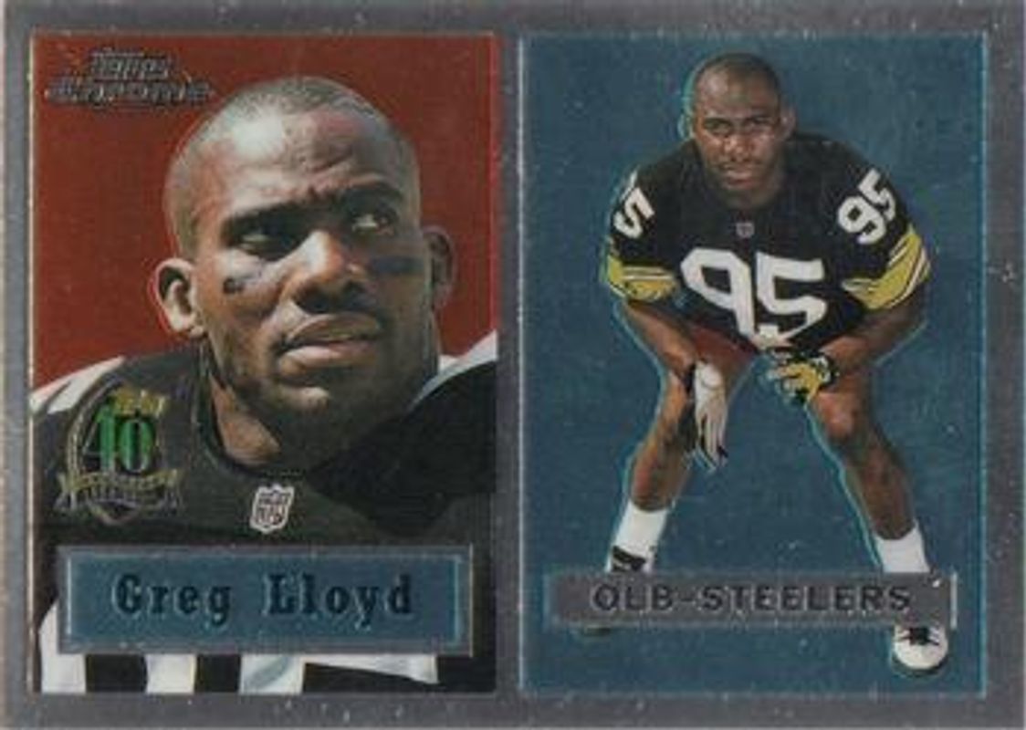 The Greg Lloyd 1996 Topps Chrome #2 40th Anniversary Retros card is 1 of 4 Greg Lloyd's card variations in the 1996 Topps Chrome set being tracked by Sports Card Investor, including Base, Refractor, and 40th Anniversary Retros - Refractor.