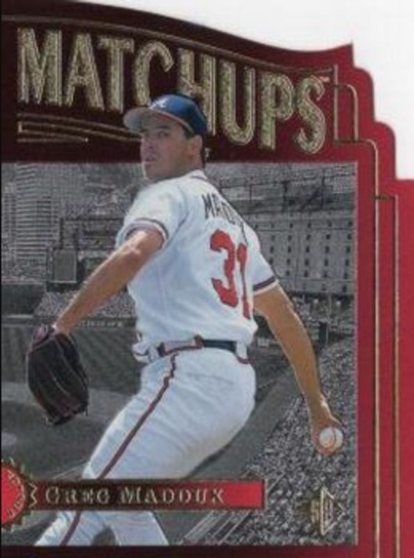 The Greg Maddux 1996 SP #MM10 Marquee Matchups die-cut card is 1 of 6 Greg Maddux's card variations in the 1996 SP set being tracked by Sports Card Investor, including Base, Baseball Heroes, Marquee Matchups, Special FX, and Special FX Red die-cut.