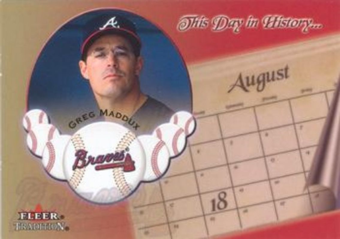 The Greg Maddux 2002 Fleer Tradition #16-DH This Day In History card is 1 of 5 Greg Maddux's card variations in the 2002 Fleer Tradition set being tracked by Sports Card Investor, including Base, Grass Roots, This Day In History - Game Used, and Grass Patch /50.