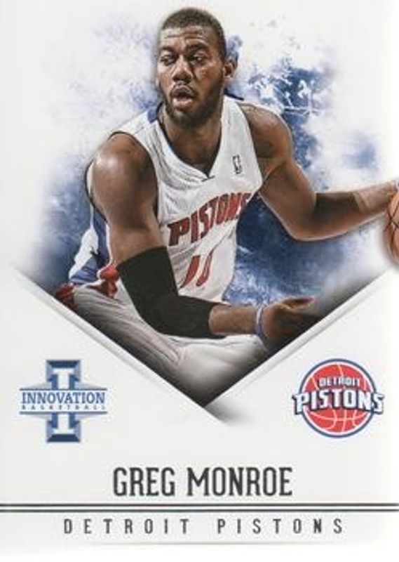 The Greg Monroe 2012 Innovation #71 Base card is 1 of 12 Greg Monroe's card variations in the 2012 Innovation set being tracked by Sports Card Investor, including Gold /10, Platinum /1, Fine Print Autographs, Innovative Ink, and Laser Cut.