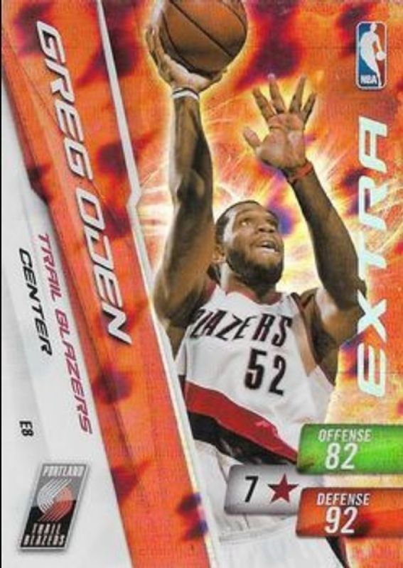 The Greg Oden 2010 Panini Adrenalyn XL #E8 Extra card is 1 of 2 Greg Oden's card variations in the 2010 Panini Adrenalyn XL set being tracked by Sports Card Investor, including Base.