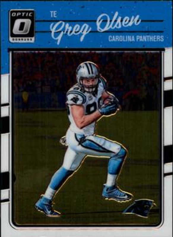 The Greg Olsen 2016 Optic #16 Base card is 1 of 11 Greg Olsen's card variations in the 2016 Optic set being tracked by Sports Card Investor, including Holo, Aqua /299, Orange /199, Blue /149, and Red /99.
