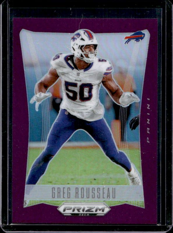 The Greg Rousseau 2024 Prizm Deca #32 Purple /99 card is 1 of 13 Greg Rousseau's card variations in the 2024 Prizm Deca set being tracked by Sports Card Investor, including Base, Silver, Red /199, Blue /149, and Orange /49.