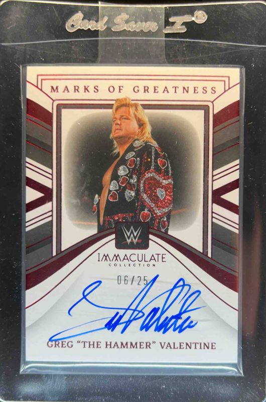 The Greg Valentine 2023 Immaculate #MG-GVL Marks of Greatness - Red /25 card is 1 of 9 Greg Valentine's card variations in the 2023 Immaculate set being tracked by Sports Card Investor, including Immaculate Ink /99, Immaculate Legends /99, Marks of Greatness /99, Immaculate Ink - Gold /10, and Marks of Greatness - Gold /10.