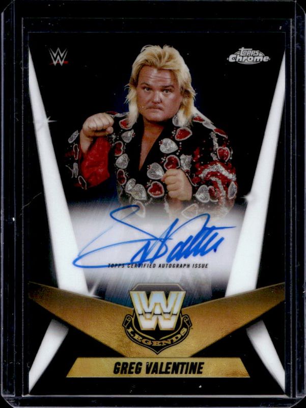 The Greg Valentine 2025 Topps Chrome WWE #LCA-GV Legendary Chrome Autographs card is 1 of 31 Greg Valentine's card variations in the 2025 Topps Chrome WWE set being tracked by Sports Card Investor, including 1985 Legends, 1985 Legends - Refractor, Legendary Chrome Autographs - Geometric Refractor, Legendary Chrome Autographs - Refractor /175, and 1985 Legends - Blue Refractor /150.