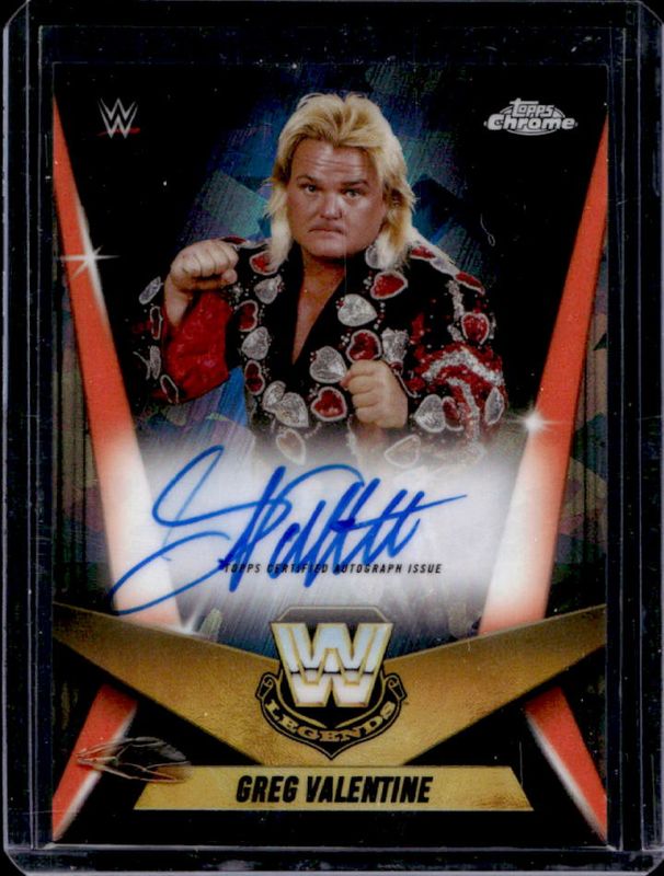 The Greg Valentine 2025 Topps Chrome WWE Sapphire Edition #LCA-GV Legendary Chrome Autographs - Orange Refractor /25 card is 1 of 4 Greg Valentine's card variations in the 2025 Topps Chrome WWE Sapphire Edition set being tracked by Sports Card Investor, including Legendary Chrome Autographs, Legendary Chrome Autographs - Red Refractor /5, and Legendary Chrome Autographs - Padparadscha /1.