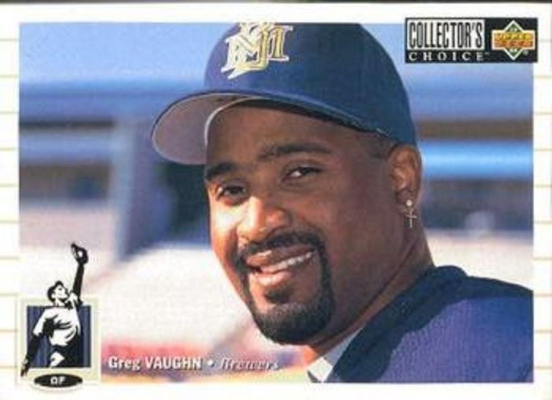 The Greg Vaughn 1994 Upper Deck Collector's Choice #585 Base card is 1 of 3 Greg Vaughn's card variations in the 1994 Upper Deck Collector's Choice set being tracked by Sports Card Investor, including Gold Signatures, and Silver Signatures.