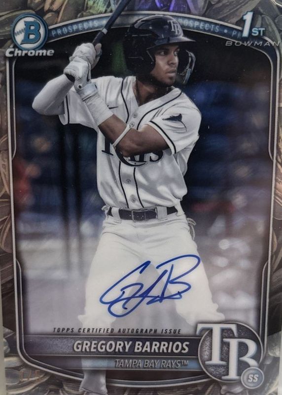 This card is 1 of 32 Gregory Barrios' card variations in the 2025 Bowman set being tracked by Sports Card Investor, including Chrome Prospect Auto (1st), Chrome Prospect Auto - Refractor /499 (1st), Chrome Prospect Auto - Speckle Refractor /299 (1st), Chrome Prospect Auto - Purple Refractor /250 (1st), and Chrome Prospect Auto - Blue Refractor /150 (1st).