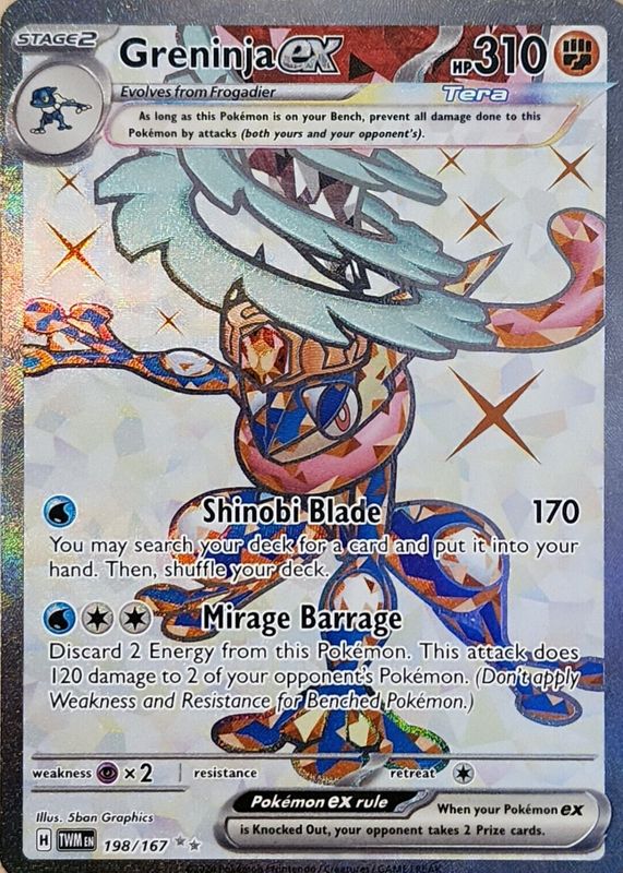 The Greninja ex 2024 Scarlet & Violet: Twilight Masquerade #198/167 Ultra Rare card in Raw TCG (Near Mint) condition has moved up $1.02 (+12.4%) in the last 30 days and was last sold for $9.25 .
