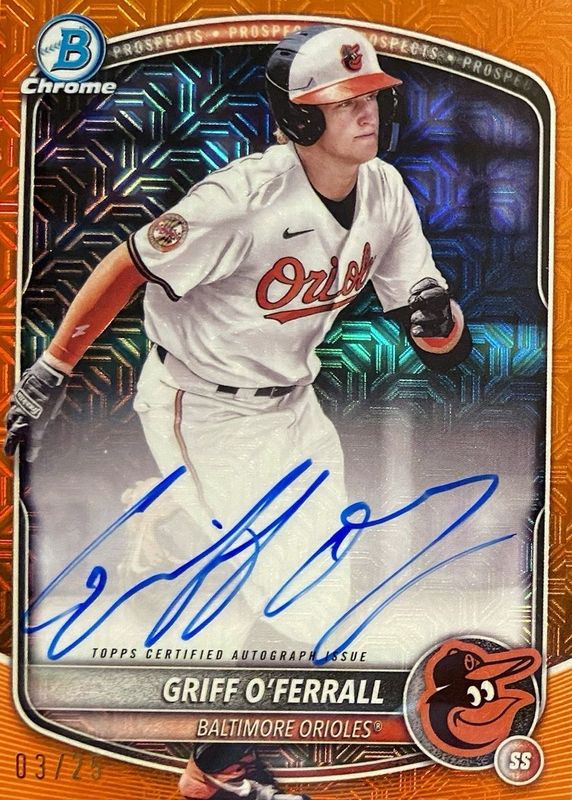 Auctions Ending Soon for Griff O'Ferrall 2025 Bowman Mega Box #BMA-GO Chrome Prospect Auto - Orange Refractor /25 RAW