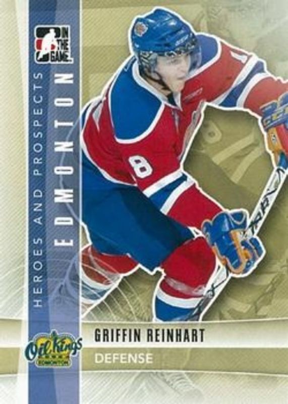 The Griffin Reinhart 2011 In The Game Heroes & Prospects #73 Base card is 1 of 26 Griffin Reinhart's card variations in the 2011 In The Game Heroes & Prospects set being tracked by Sports Card Investor, including Autographs, Class of 2012, Complete Jersey Silver, Game Used Emblems Black, and Game Used Emblems Silver.