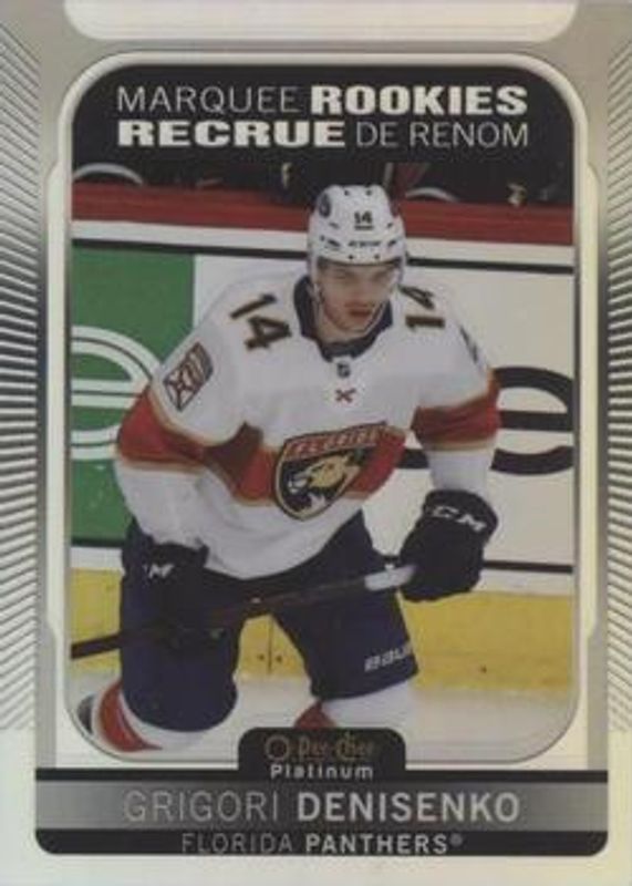 The Grigori Denisenko 2021 O-Pee-Chee Platinum #208 Rainbow Rookie card is 1 of 41 Grigori Denisenko's card variations in the 2021 O-Pee-Chee Platinum set being tracked by Sports Card Investor, including Base, Black Shield (Marquee Rookies), Blue Surge, Matte Pink, and Neon Yellow Surge.