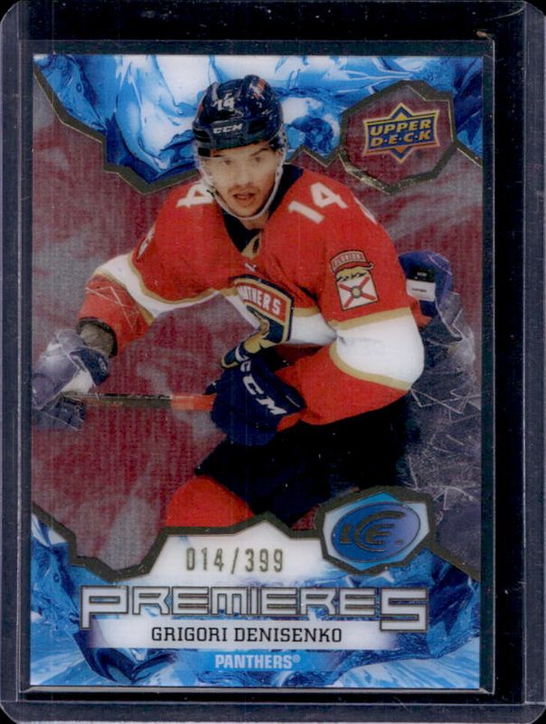 The Grigori Denisenko 2021 Upper Deck Ice #227 Red /399 Rookie card is 1 of 35 Grigori Denisenko's card variations in the 2021 Upper Deck Ice set being tracked by Sports Card Investor, including #227 Base /999, #146 Base /999, #146 Ice Blue, #146 Jersey, and #146 Lavender.