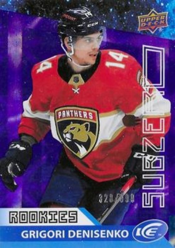 The Grigori Denisenko 2021 Upper Deck Ice #SZ-38 Sub Zero /999 Rookie card is 1 of 35 Grigori Denisenko's card variations in the 2021 Upper Deck Ice set being tracked by Sports Card Investor, including #227 Base /999, #146 Base /999, #146 Ice Blue, #146 Jersey, and #146 Lavender.