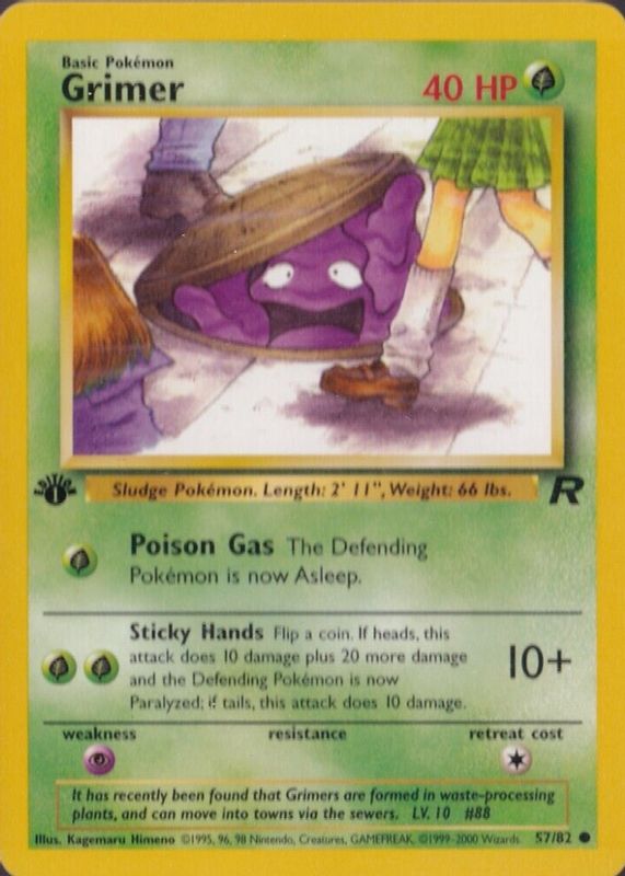 The Grimer 2000 Team Rocket #57/82 1st Edition card in Raw TCG (Near Mint) condition has moved up $1.07 (+29.8%) in the last 30 days and was last sold for $4.66 .