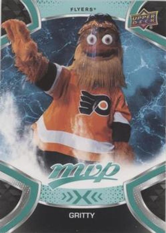 The Gritty 2021 Upper Deck MVP #0 Mascot Gaming Achievement card is 1 of 7 Gritty's card variations in the 2021 Upper Deck MVP set being tracked by Sports Card Investor, including Mascots Gaming, Mascots Gaming Sparkle, Mascot Gaming - Printing Plates Black /1, Mascot Gaming - Printing Plates Cyan /1, and Mascot Gaming - Printing Plates Magenta /1.