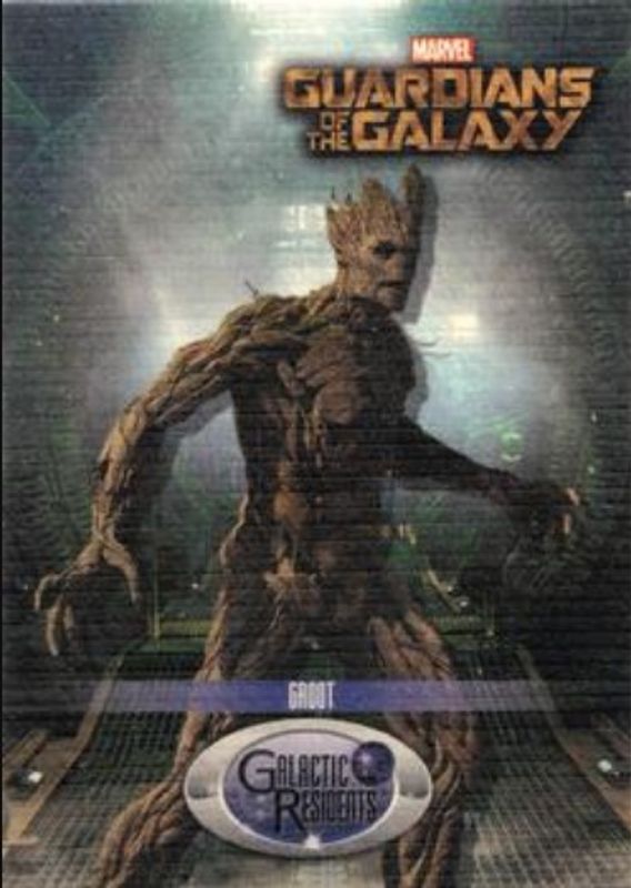 The Groot 2014 Upper Deck Guardians of the Galaxy #GR-4 Galactic Residents card is 1 of 10 Groot's card variations in the 2014 Upper Deck Guardians of the Galaxy set being tracked by Sports Card Investor, including #116 Base, #119 Base, #116 Bronze, #119 Bronze, and #119 Retail.