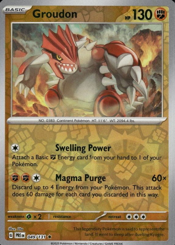 The Groudon 2025 Scarlet & Violet: Prismatic Evolutions #049/131 Reverse Holo card in Raw TCG (Near Mint) condition has not changed in price in the last 30 days and was last sold for $1.49 .