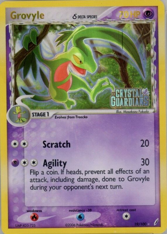 The Grovyle 2006 EX: Crystal Guardians #019/100 Reverse Holo card in Raw TCG (Near Mint) condition has not changed in price in the last 30 days and was last sold for $38.49 .