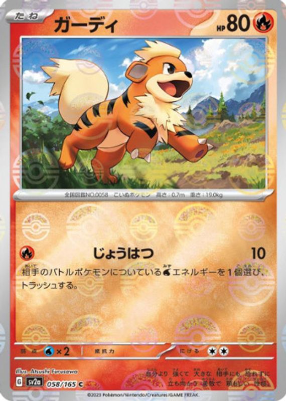 The Growlithe 2023 Japanese Scarlet & Violet: 151 #058/165 Reverse Holo card in Raw TCG (Lightly Played) condition has not changed in price in the last 30 days and was last sold for $2.48 .