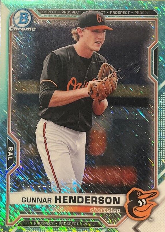This card is 1 of 21 Gunnar Henderson's card variations in the 2021 Bowman set being tracked by Sports Card Investor, including Chrome Prospects - Atomic Refractor, Chrome Prospects - Refractor /499, Chrome Prospects - Speckle Refractor /299, Chrome Prospects - Purple /250, and Chrome Prospects - Fuchsia Refractor /199.