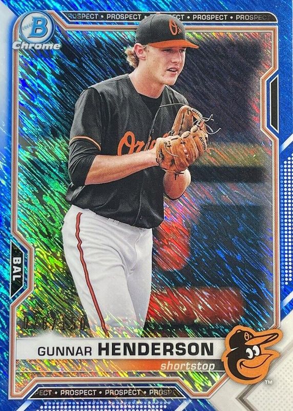 Best Prices Available For Sale of Gunnar Henderson 2021 Bowman #BCP-49 Chrome Prospects - Blue Shimmer Refractor /150