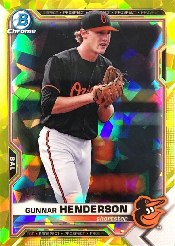 The Gunnar Henderson 2021 Bowman #BCP-49 Chrome Prospects - Gold Refractor /50 card in Raw condition has not changed in price in the last 30 days and was last sold for $43.00 .