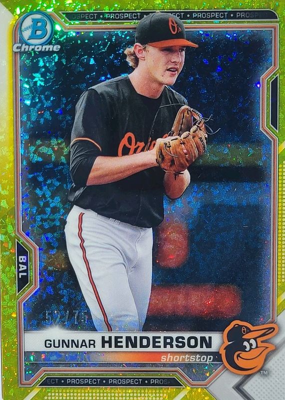 This card is 1 of 21 Gunnar Henderson's card variations in the 2021 Bowman set being tracked by Sports Card Investor, including Chrome Prospects - Atomic Refractor, Chrome Prospects - Refractor /499, Chrome Prospects - Speckle Refractor /299, Chrome Prospects - Purple /250, and Chrome Prospects - Fuchsia Refractor /199.