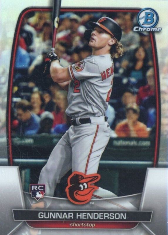 This card is 1 of 3 Gunnar Henderson's card variations in the 2023 Bowman Chrome set being tracked by Sports Card Investor, including Base, and Color Run Rookies /23.