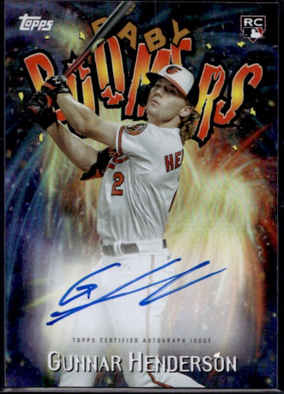 The Gunnar Henderson 2023 Topps Archives #98BB-GH 1998 Topps Baby Boomers Autographs - Gold Foil /50 Rookie card is 1 of 20 Gunnar Henderson's card variations in the 2023 Topps Archives set being tracked by Sports Card Investor, including #202b Base, #202 Base, #202 Rainbow Foil /199, #202 Green Foil /99, and #202 Aqua Sparkle Foil /75.