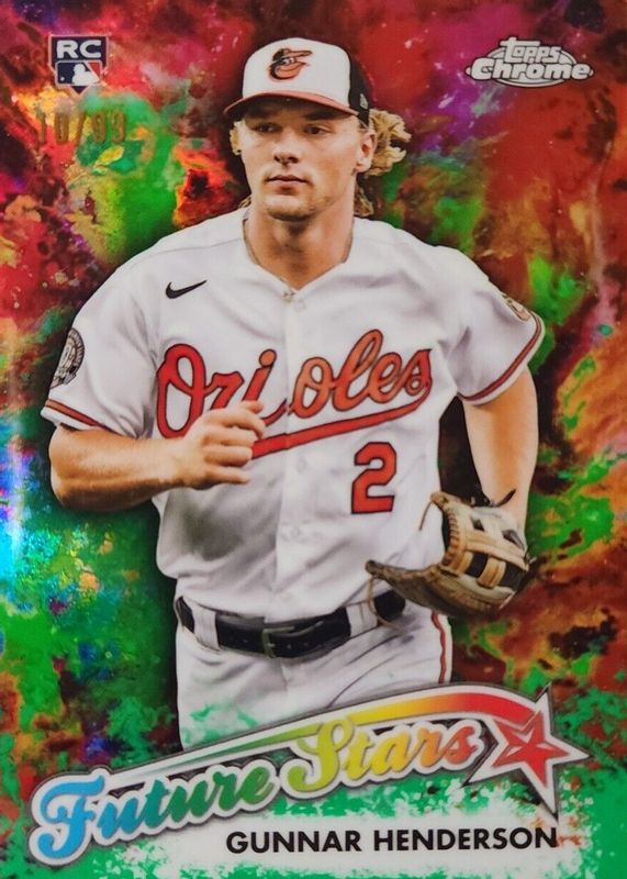 The Gunnar Henderson 2023 Topps Chrome #FS-18 Future Stars - Green Refractor /99 Rookie card in Raw condition has moved up $25.50 (+131%) in the last 30 days and was last sold for $45.00 .