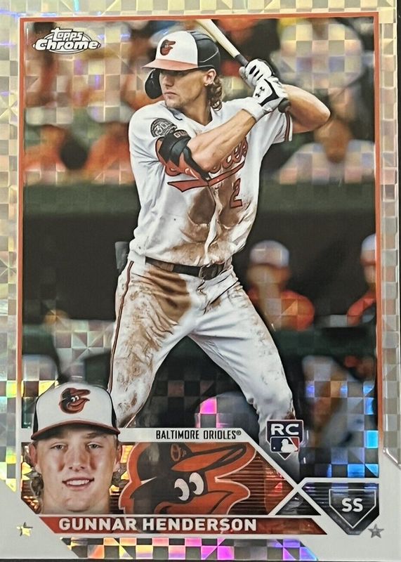 The Gunnar Henderson 2023 Topps Chrome #2 X-Fractor Rookie card in Raw condition has moved down -$1.50 (-15.0%) in the last 30 days and was last sold for $8.50 .