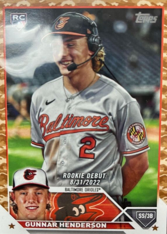Gunnar Henderson 2023 Topps Update #US18 Rookie Debut - Memorial Day Camo /25 RAW Price Guide