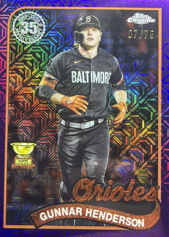 The Gunnar Henderson 2024 Topps Silver Pack #2T89C-8 1989 Chrome Promo - Purple Refractor (Series 2) /75 card in Raw condition has not changed in price in the last 30 days and was last sold for $13.95 .