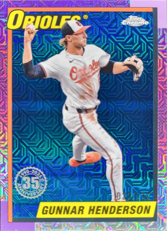 The Gunnar Henderson 2025 Topps #T90C-1 1990 Baseball Chrome Silver Pack - Blue Refractor /150 card is 1 of 340 Gunnar Henderson's card variations in the 2025 Topps set being tracked by Sports Card Investor, including #409 Base, #65 Base, #409 Aqua Holo Foil, #65 Aqua Holo Foil, and #409 Diamante Foil.