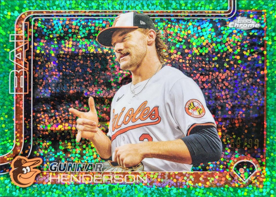 The Gunnar Henderson 2025 Topps Chrome #213 Base Image Variation - Green Speckle Refractor /99 card is 1 of 102 Gunnar Henderson's card variations in the 2025 Topps Chrome set being tracked by Sports Card Investor, including Base, Geometric Refractor, Image Variation, Lightboard Logo Variation, and Negative Refractor.