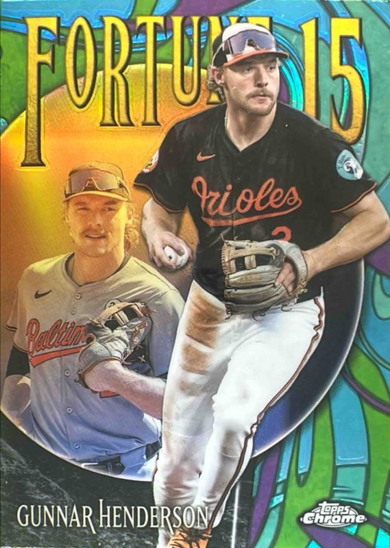 The Gunnar Henderson 2025 Topps Chrome #F15-2 Fortune 15 card is 1 of 102 Gunnar Henderson's card variations in the 2025 Topps Chrome set being tracked by Sports Card Investor, including Base, Geometric Refractor, Image Variation, Lightboard Logo Variation, and Negative Refractor.