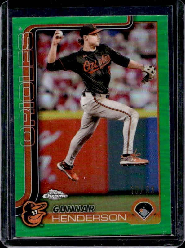 The Gunnar Henderson 2025 Topps Chrome #213 Green Refractor /99 card is 1 of 102 Gunnar Henderson's card variations in the 2025 Topps Chrome set being tracked by Sports Card Investor, including Base, Geometric Refractor, Image Variation, Lightboard Logo Variation, and Negative Refractor.