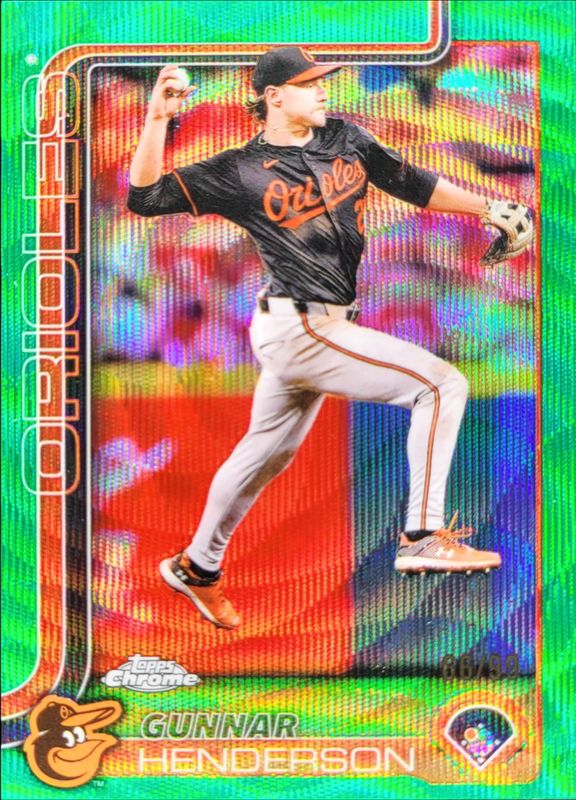 The Gunnar Henderson 2025 Topps Chrome #213 Green Wave Refractor /99 card is 1 of 102 Gunnar Henderson's card variations in the 2025 Topps Chrome set being tracked by Sports Card Investor, including Base, Geometric Refractor, Image Variation, Lightboard Logo Variation, and Negative Refractor.