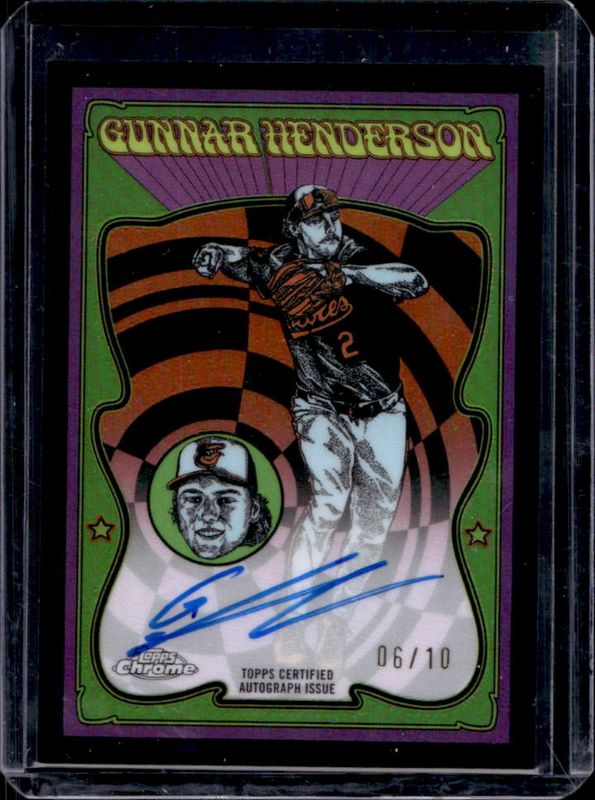 The Gunnar Henderson 2025 Topps Chrome #UVA-GH Ultraviolet All-Stars Autographs - Black Refractor /10 card is 1 of 102 Gunnar Henderson's card variations in the 2025 Topps Chrome set being tracked by Sports Card Investor, including Base, Geometric Refractor, Image Variation, Lightboard Logo Variation, and Negative Refractor.