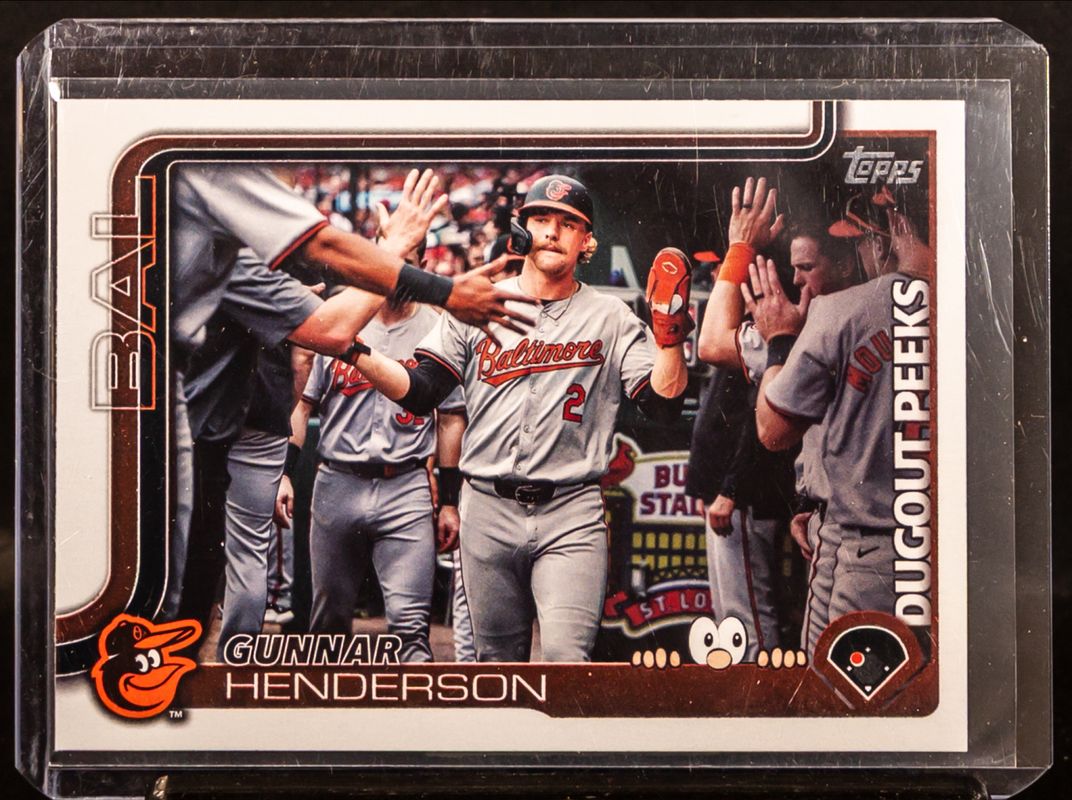 The Gunnar Henderson 2025 Topps #DP-10 Dugout Peeks card is 1 of 340 Gunnar Henderson's card variations in the 2025 Topps set being tracked by Sports Card Investor, including #409 Base, #65 Base, #409 Aqua Holo Foil, #65 Aqua Holo Foil, and #409 Diamante Foil.