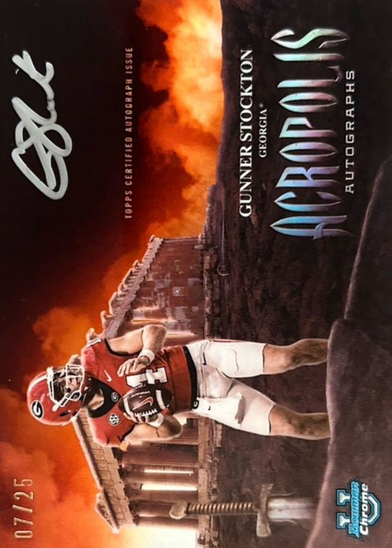The Gunner Stockton 2025 Bowman Chrome University #AA-GS Acropolis Autographs - Orange Refractor /25 card in Raw condition has not changed in price in the last 30 days and was last sold for $325.00 .
