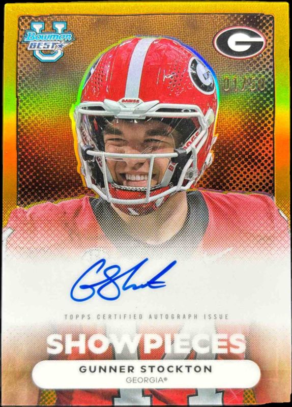 The Gunner Stockton 2025 Bowman's Best #BSA-GS Showpieces Autographs - Gold Refractor /50 card is 1 of 73 Gunner Stockton's card variations in the 2025 Bowman's Best set being tracked by Sports Card Investor, including Base, Refractor, Shimmer Refractor, Yellow Lazer Refractor /250, and Aqua Lava Refractor /199.