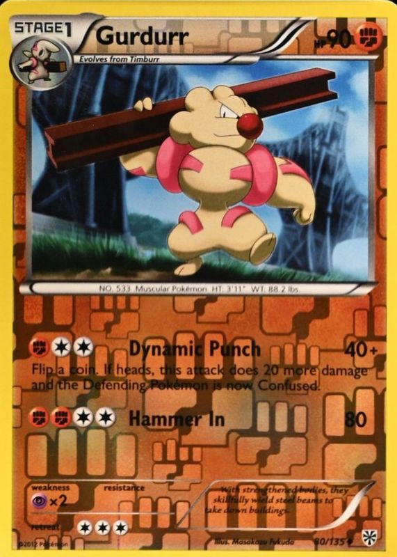 The Gurdurr 2013 Black & White: Plasma Storm #080/135 Reverse Holo card in Raw TCG (Lightly Played) condition has not changed in price in the last 30 days and was last sold for $3.22 .