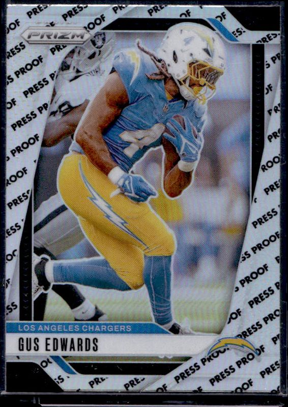 The Gus Edwards 2024 Prizm #158 Press Proof /(SSP) card is 1 of 83 Gus Edwards' card variations in the 2024 Prizm set being tracked by Sports Card Investor, including Base, Choice Blue Yellow Green, Choice Silver, Disco, and Green.