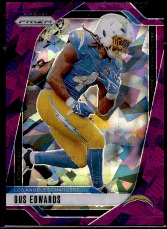 The Gus Edwards 2024 Prizm #158 Purple Ice /225 card is 1 of 83 Gus Edwards' card variations in the 2024 Prizm set being tracked by Sports Card Investor, including Base, Choice Blue Yellow Green, Choice Silver, Disco, and Green.