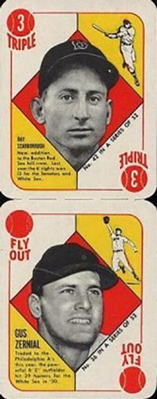 The Gus Zernial / Ray Scarborough 1951 Red Backs #42-36b Red Backs Panels card is 1 of 2 Gus Zernial / Ray Scarborough's card variations in the 1951 Red Backs set being tracked by Sports Card Investor, including Red Backs Panels.