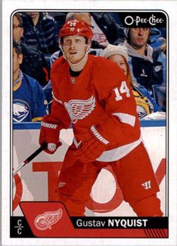 The Gustav Nyquist 2016 O-Pee-Chee #450 Base card is 1 of 6 Gustav Nyquist's card variations in the 2016 O-Pee-Chee set being tracked by Sports Card Investor, including Rainbow Foil, Retro, Retro Blank Back, Black Rainbow Foil /100, and Red Border.