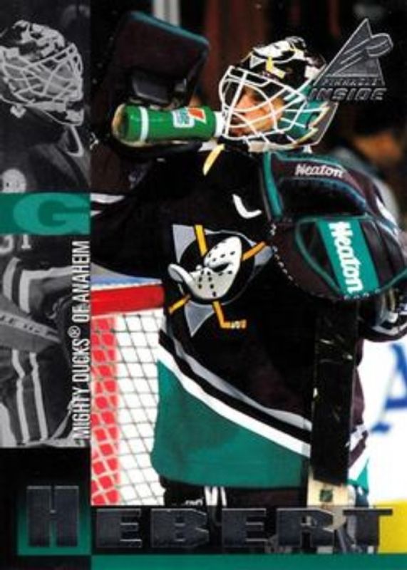 The Guy Hebert 1997 Pinnacle Inside #70 Base card is 1 of 9 Guy Hebert's card variations in the 1997 Pinnacle Inside set being tracked by Sports Card Investor, including Coaches Collection, Executive Collection, Cans, Cans - Gold, and Large Can Goalie.